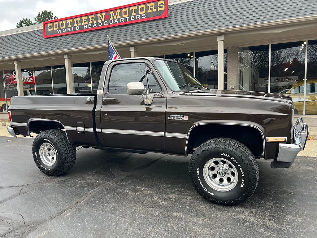 Clean Short Box Sierra Classic 4X4, Recent Body-Up Restoration, factory (8267) Dark Brown metallic, factory Saddle cloth interior, 5.7 liter EFI engine, factory intake & exhaust manifolds, factory air cleaner & valve covers, power steering, power front disc brakes, factory air condition, 700R4 automatic transmission, factory bench seat, tilt column, factory dash & gauges, power windows & locks, Sony sounds system, Flowmaster exhaust, factory 3.73 limited slip rear axle, new 33X12.5R15LT BF Goodrich All Terraine T/A tires, 15” Pacer aluminum wheels, Rough Country lift kit, factory jack, tinted glass, dual chrome mirrors, Rhino lined bed, front spoiler, factory bumper guards, dual tanks, original owner’s manual & SPED tag. Clean Carfax. One Clean GMC!