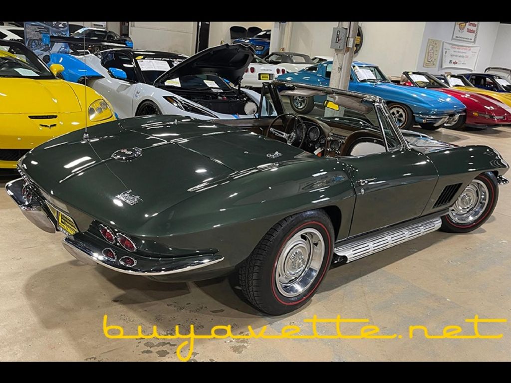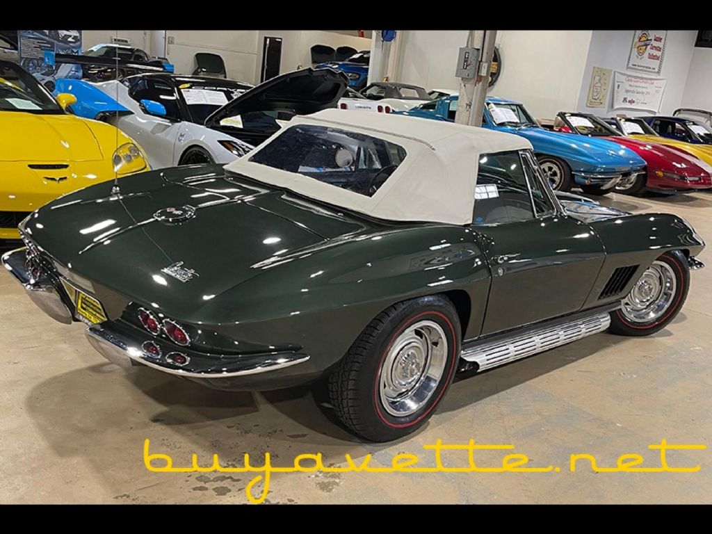 FREE SHIPPING! Were currently offering a $500 discount when shipping this vehicle. Please note that this promotion cannot be combined with any other offers or discounts. SEE MORE PHOTOS OF THIS CORVETTE, ALONG WITH MANY OTHERS, AT WWW.BUYAVETTE.NET! OUR VEHICLES RECEIVE A DETAILED INSPECTION, AND MOST COME WITH A LIMITED WARRANTY AT NO EXTRA COST. Code correct Goodwood Green exterior, code correct Saddle interior (upgraded to leather seating), matching auxiliary hardtop, White convertible top. NOM 327ci engine, 4 speed manual transmission. Features include factory air conditioning, power steering, side exhaust, AM/FM radio, genuine leather seats, redline tires. Originally assembled on February 15, 1967, this 1967 Corvette Convertible is LOADED with features rarely found on '67s, and is in overall good condition. Odometer currently reads 37,294 miles; however, we are unable to document actual miles on this car, so it will be sold as MILEAGE EXEMPT. This car was repainted in 2019, and shows good-vg paint with a great shine. Convertible top is avg. Chrome bumpers show a good condition finish, and taillights, weatherstripping, rally wheels, trim rings, and center caps are all vg. BF Goodrich Silvertown Radial redline tires show an average of 10/32nds tread depth remaining. The interior of this 1967 Corvette Convertible shows good condition steering wheel and dash pods, and good-vg center console and door panels. Carpet, seats, and gauges are avg. Correct appearing AM/FM radio is in place. NOM 327ci engine shows casting number 3959512, with correct ignition shielding in place. Additions to this engine include a Holley carburetor, L79 intake manifold, polished L79 style valve covers, flex fan, and chrome water pump pulley/alternator bracket/hood prop rod. Frame is solid and rust-free. Included with this car will be receipts since 2019. Call us today to bring home this factory air '67 droptop! FREE 2 YEAR/50K ADDITIONAL MILE LIMITED WARRANTY, GOOD AT ANY REPAIR FACILITY NATIONWIDE!! Our Price: $89,999 or 20% down with payments as low as $1,280/month W.A.C.
