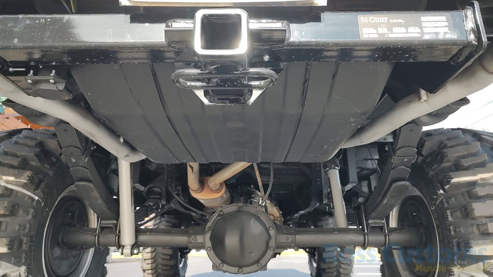 Under the hood we have the original 350, factory AC, power steering, power disc brakes, factory exhaust manifolds into 2 1/2 inch exhaust with stainless muffler and dual tailpipes out the back, manual 4 speed trans, brand new 6 inch Rough Country lift, all springs - no blocks, new shocks, new drive shafts.