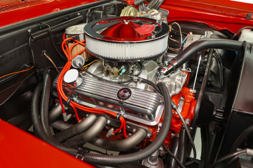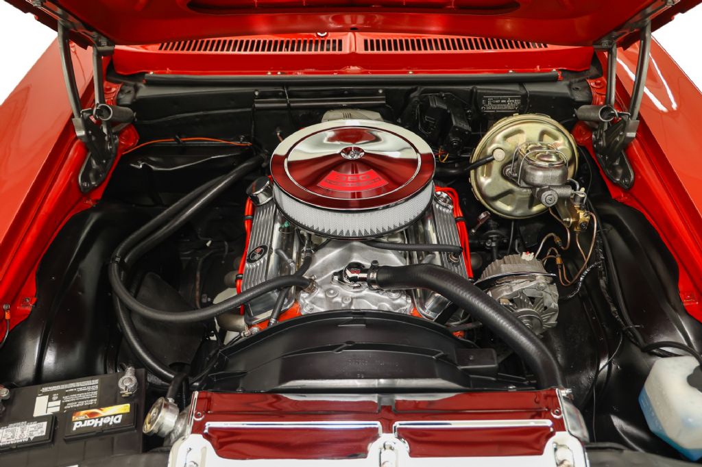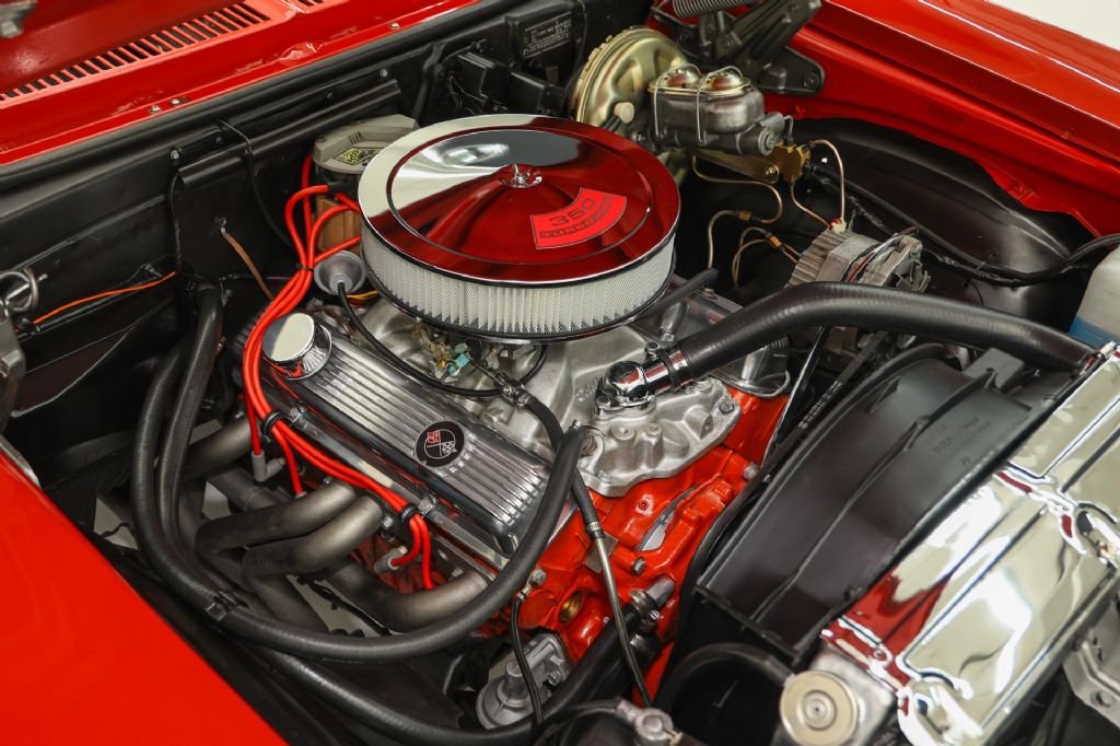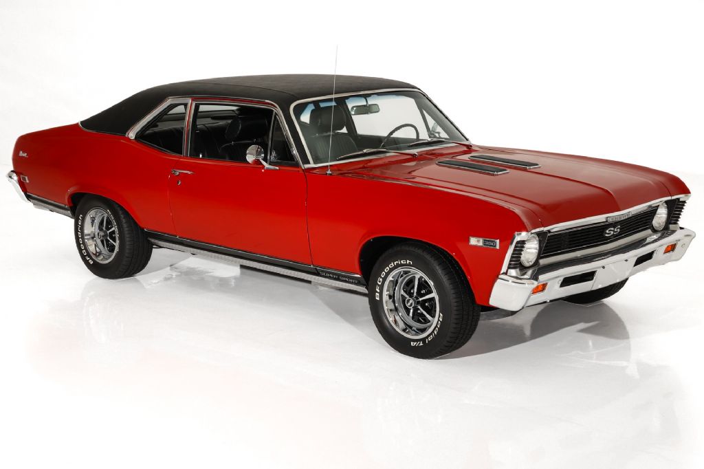 Matador Red 1968 SS Nova with black vinyl top and black bucket seat interior and console wrapped around the factory 4-speed transmission and backed by a 12-bolt posi-traction rear end to put the rubber to the road. This Chevy II SS Nova is nicely optioned with a 300hp 350 engine, power front disc brakes and aluminum radiator. This rare Super Sport was originally sold at the famous Berger Chevrolet in Grand Rapids Michigan. A binder contains many receipts for the frame on restoration that was performed in 2019. The floors, trunk and exterior sheet metal appears to be all original with excellent gaps and body lines. Rolling on classic Super Sport 5 spoke wheels and BF Goodrich Radial T/A white letter tires for timeless good looks.