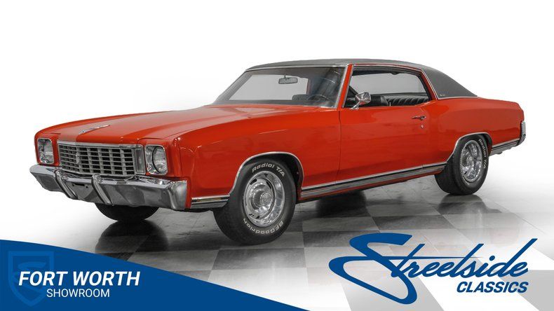 This 1972 Chevrolet Monte Carlo showcases one of GM's most successful first-generation designs, selling over 180,000 units in '72 alone. The Flame Orange exterior radiates muscle car excellence, perfectly complemented by a black vinyl top that flows with the car's sweeping lines. The 15-inch Rally wheels add athletic appeal, wrapped in BF Goodrich Radial T/A 235/75R15 front and 275/70R15 rear tires for the perfect stance. The chrome bumpers and trim gleam against the paint, creating a powerful presence that exemplifies American muscle car design.