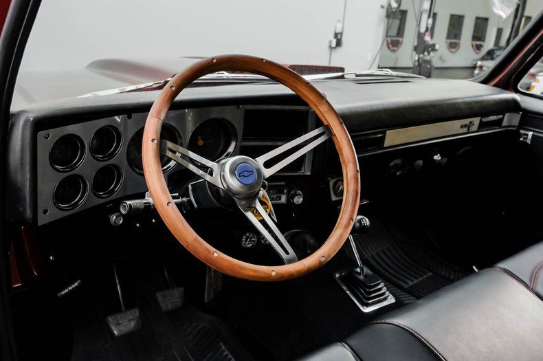Glance inside, and you'll see a custom-contoured black vinyl bench seat at the center of a very clean interior, bracketed by new matching door panels and sitting above carpet with a spotless appearance that suggests it was only recently added. A wood-rimmed steering wheel sits on the tilting column, and the instrument panel beyond it houses an array of factory gauges that are joined by a pair of aftermarket AutoMeter counterparts just below to better monitor motoring functions.