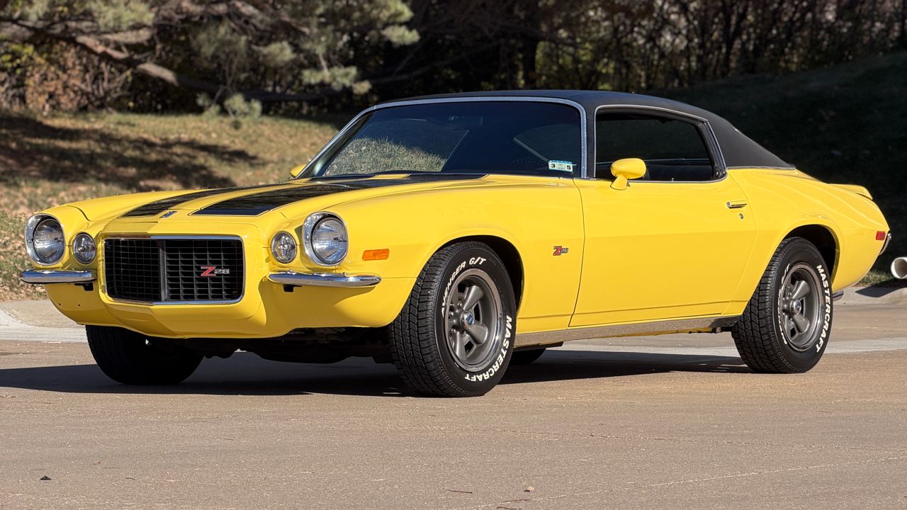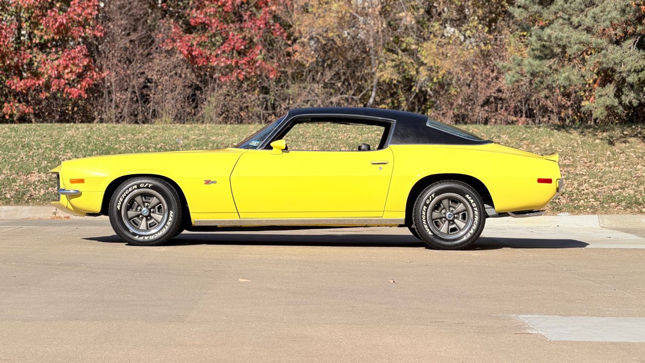 KC Classic Auto is proud to present this AMAZING 1970 Camaro RS Z28, A.K.A. Tonya!Beautifully restored and refinished in its original Daytona Yellow with Black stripes and Black vinyl top. The paint and body are in excellent condition!Black and White Deluxe cloth interior has been restored and is in excellent condition. Factory Z87 Custom Interior option that includes: deluxe cloth seats, glove compartment light, additional instrument cluster lighting, wood grained accents on instrument cluster/steering wheel/door panels, special hood and interior insulation.Powered by a 350ci/360hp LT1 V8 (believed to be original). During a past rebuild, the block was decked and the VIN is no longer visible, but the casting number (3970010) and build date of 12/15/1969 align.Power is sent to the ground with a date code correct Muncie 4-speed transmission and correct COZ code 3.73 Eaton positraction 12-bolt rear end.Other factory options include: power steering, power brakes (front disc), console, rear window defrost, 1-piece low-profile spoiler, rear bumper guards, black stripes.Dont miss the chance to own this super rare RS Z28! Visit KC Classic Auto online at kcclassicauto.com to see more pictures of this vehicle or call us at 913-888-1234.