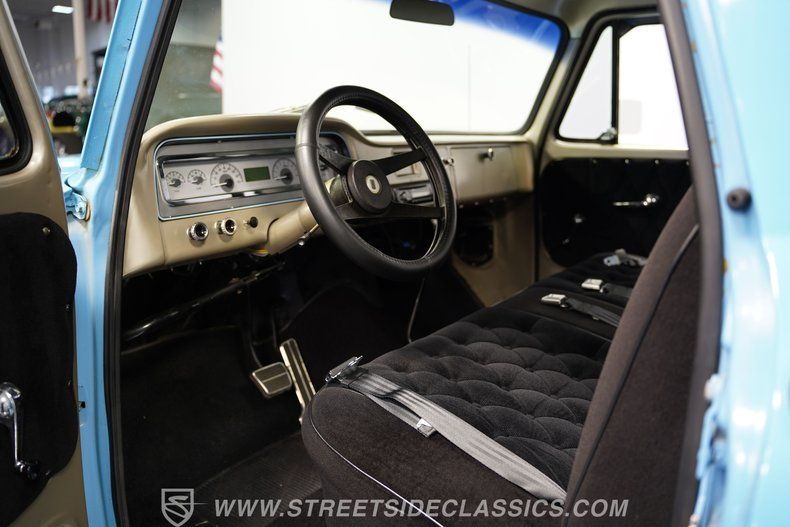Inside, the 1965 GMC C10 Stepside welcomes you with a simple yet inviting interior. The diamond stitch seats are comfortable and in good shape, complemented by matching door panels that enhance the cohesive look. The carpet and painted dash maintain their integrity, showcasing a well-preserved cabin. Modern touches like aftermarket gauges and a Pioneer radio blend seamlessly with the truck's classic vibe, while all glass and seals remain intact. Doors close solidly, reflecting a quality restoration that respects the truck's heritage.
