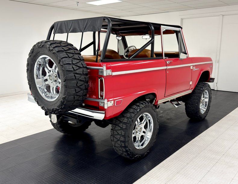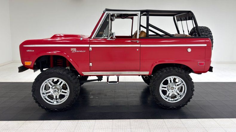 Right before the two stage Rangoon Red strikes your eyes, your brain is processing the sheer height of this classic SUV which towers over stock examples. It's achieved by a lift kit of course, and the 20-inch American Racing wheels with 35x12.50R20LT all terrain tires on board. If you've ever retrofitted a matchbox or RC truck to be big and brash, here's the full sized example. Back to the paint, which is stunning, and augmented by a stainless side spear, rocker trim, and a function hood scoop/power bulge. Chrome bumpers cap the ends and an extra wheel is mounted on the back. A black canvas bikini top fits over the roll bars and a much needed step up is mounted to each side under the doors. Ford is expressed in red on the chrome grille and hood pins keep the fiberglass hood in place. Paint and trim is neart excellent and we could find no glaring imperfections on the outside.