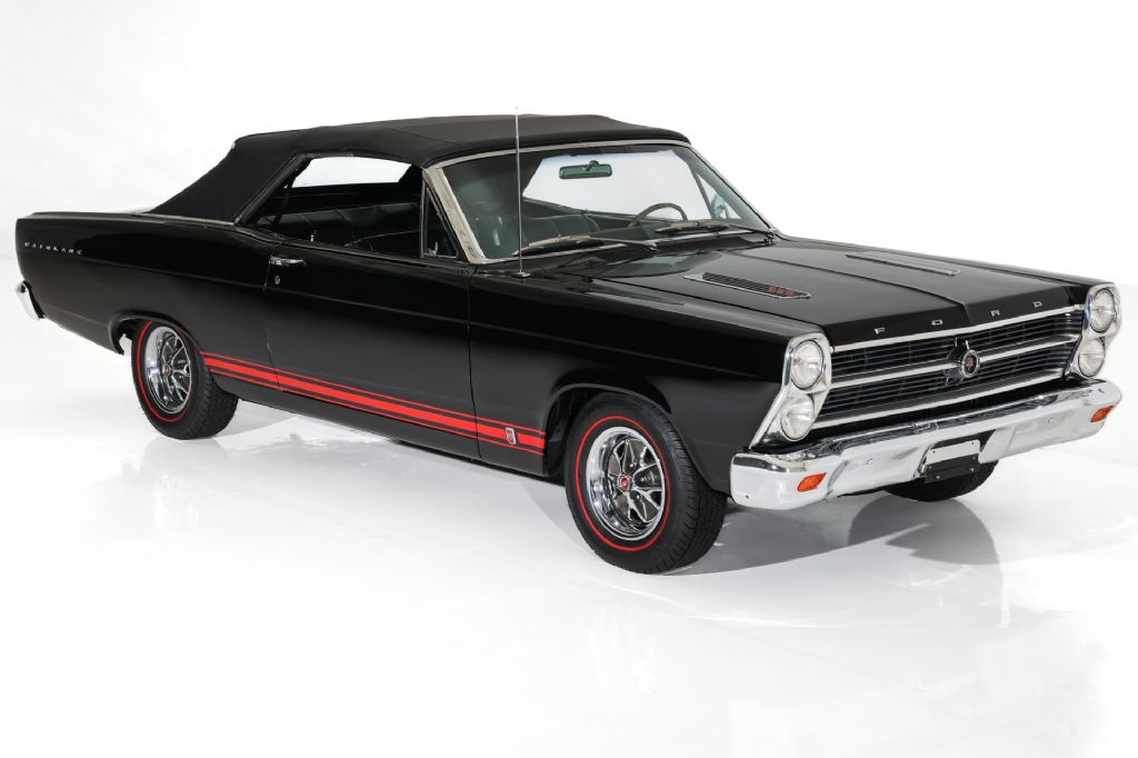 Triple Black Ford Fairlane GT 390 Convertible with new black paint, new black power top and black bucket seat and console interior. This rare GT is validated by the 76D body code and powered by its original S-Code 390 cubic inch, big block engine and launched in to high gear with the original Top Loader 4-Speed transmission. The 9 inch rear is a very posi locker rear end with a 3.25 gear and will definitely put the rubber to the road. This GT is all muscle car with no power options. Professionally painted mirror finish black paint with new bumpers added and lots of new and original well preserved trim. According to the previous owner, this is an original, 52,000 mile car that has been in a climate controlled environment for most of it life and has registrations to validate the low mileage and an incredibly well preserved time bubble GT with all original factory metal structure. This triple black Ford Fairlane GT convertible is rolling on correct Ford chrome wheels and newer redline radials for that investment grade muscle car curb appeal.
