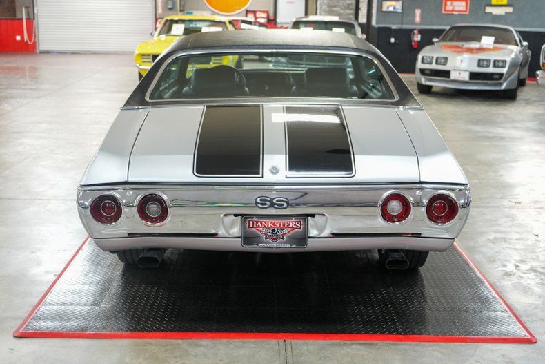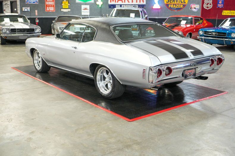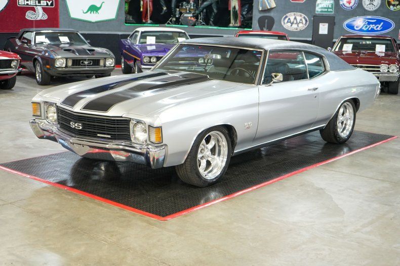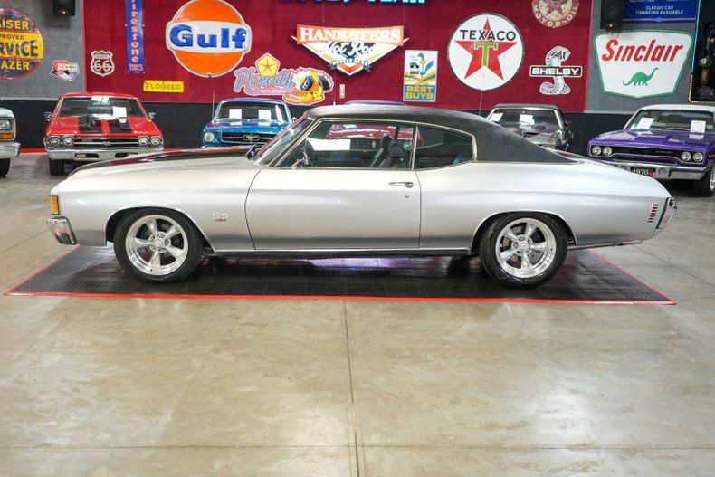 This 1972 Chevrolet Chevelle blends classic muscle with modern upgrades, powered by a stout 454 Big Block Chevy V8 mated to a TH400 automatic transmission and a 3.31-geared 10-bolt rear end. Equipped with power steering, power brakes, and 4-wheel disc brakes, it delivers confident performance. The Holley Sniper EFI system atop a Weiand Stealth intake ensures modern throttle response, aided by an HEI distributor, electric fuel pump, and electronic ignition. Styled with a black vinyl top, silver exterior with black stripes, and 17" American Racing Torq Thrust wheels, this Chevelle is as aggressive as it is refined.