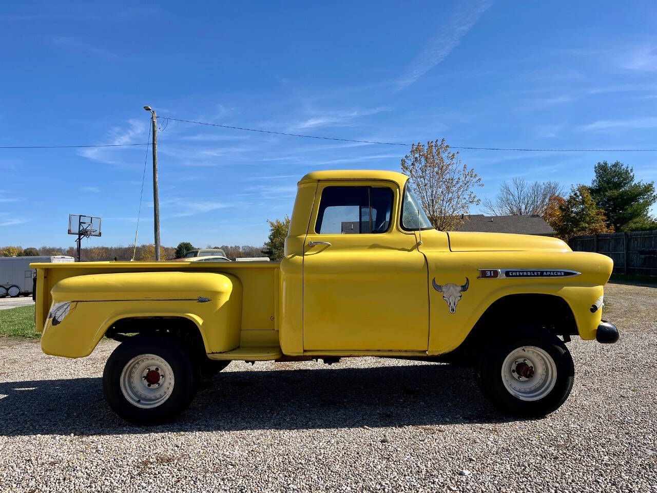 FOR SALE AT AND OWNED BY 500 CLASSIC AUTO -BEST TO CALL 765-345-5211. GOOD OL' 59 CHEVY 3100 SHORT BED WITH FACTORY NAPCO 4X4. RARE TRUCK AND MORE RARE WITH SHORT BED. HAS NICE RUNNING 283 2BBL, 4 SPEED MANUAL W/ GRANNY GEAR, LIFTED 3 OR 4 INCHES AND MILES UNKNOWN. SOME PHOTOS SHOW IT BRIGHTER YELLOW THAN OTHERS. IT IS MORE OF THE DULLER COLOR SEEN IN PHOTOS BUT SHE DOES RUN AND DRIVE. WITH JUST A LITTLE WORK SHE CAN BE STREET LEGAL. NO GLASS NEEDED. LAST OWNER JUST PUT ALL NEW TINTED GLASS IN HER. NOTE : I HAVE POSTED 106 PHOTOS AND A VIDEO AT www.500classicauto.com. SELLING TRUCK AS IS WITH NO WARRANTY. HAVE CLEAN INDIANA TITLE WITH NO MILES ON IT. WHATS NEEDED FOR ROAD - SOME THINGS ARE TAIL LIGHTS, WIPERS, REAR BRAKES. WE GOT FRONTS WORKING. REAR NEEDS AT LEAST A NEW HOSE AND LIKELY WHEEL CYLINDERS. WE CLEANED LEFT FRONT AND ADDED HOSE TO MAKE IT WORK. MASTER CYLINDER WORKS BUT LEAKS SOME FROM THE SEAL. BATTERY DON'T CHARGE. EXHAUST LEAKS AT FRONT. TURN SIGNAL ON DASH FLASHES BUT THE OUTSIDE DONT FLASH. HEADLIGHTS WORK AND TEMP AND OIL PRESSURE WHICH IS GOOD. CLUTCH WORKS AND TRANS SHIFTS GREAT. 4 X4 HI AND LO WORKS AND LOCK OUTS. BODY - DOORS WORK GREAT. IT SEEMS YOU ALWAYS HAVE TO SLAM THEM ON THESE TRUCKS BUT NOT THIS ONE AND THEY ARE SOLID. THE FENDERS ARE REPAIRABLE BUT BEEN PATCHED BEFORE. I THINK BUY NEW. THE TOP AND AT TOP OF WINDSHIELD IS NICE. NICE HOOD. BED IS PRETTY GOOD EXCEPT SOME FLOOR RAILS AND 1 FENDER. FRAME IS REALLY GOOD. I KNOW LOOKING AT REAR FRAME PHOTOS SHOWS WHAT COULD BE RUFF SPOTS BUT ITS JUST FLACKY PAINT AND LITE SURFACE RUST. CAB CORNERS NEED WORK. IF YOU END UP SHIPPING THIS TRUCK AND WANT THAT REAR BUMPER I WILL WIRE IT TO BED SO IT DON'T COME OUT. OTHER PARTS IN PHOTOS CAN GO IN CAB TO SHIP. INSIDE - I WOULD BUY EVERYTHING FOR INSIDE IF RESTORING. FLOOR IS SOILD. STEPS HAD BEEN REDONE BUT YOU MAY WANT REDO SOME OF IT. I BOUGHT THIS TRUCK FROM A GUY WHO FLIPS CARS. HE GOT IT OUT OF N. CAROLINA. HE PUT ALL NEW GLASS IN IT SINCE WINDSHIELD WAS BUSTED. HE ALSO GOT IT CHANGED TO INDIANA TITLE. I JUST GOT FRONT BRAKES TO WORK AND CHECKED FLUIDS. I WOULD SAY THIS THING WAS PAINTED BACK 20 TO 30 YEARS AGO. I POSTED PHOTO OF THE ENGINE SUFFIX CODE D. ONLINE SHOWS ITS A 283 ENG FROM 1958 TO 1964. I CANT SEE THE CASTING # BEHIND ENGINE OR DATE. SHE WILL MAKE A GOOD TRUCK TO RESTORE OR TO JUST ROLL AROUND IN IT. SHIPPING - WE CAN DELIVER ALL OVER. I NEED CITY AND ZIP TO PRICE. FINANCING - SOME COMPANIES WILL LOAN ON THIS TRUCK. PLEASE CALL ME TO GO OVER IT.