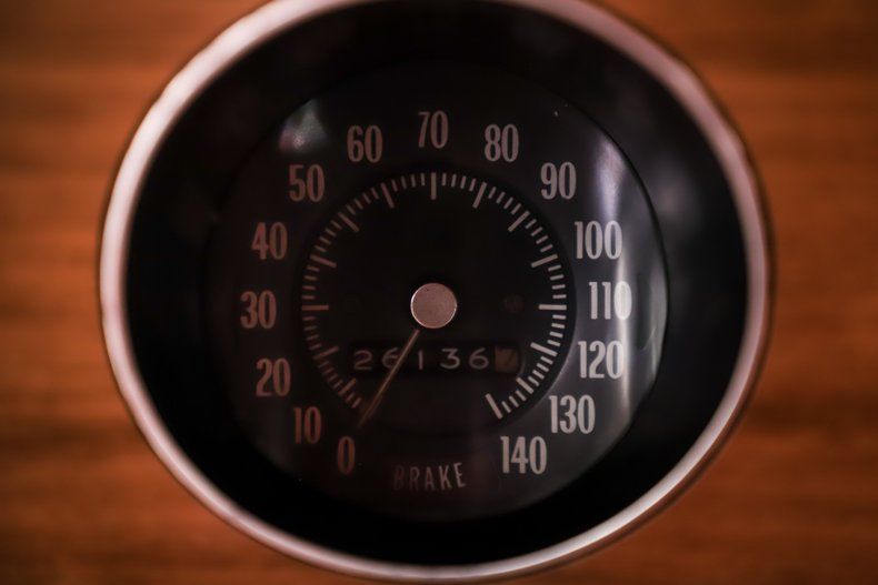 INTERIOR: The red pops! Inside this car is in outstanding condition, mostly replaced. Fresh red carpet and reproduction mats on the floor. The console looks new and has the correct T-handle on the Hurst shifter. The seats were recushioned and upholstered. Door panels and armrests were replaced. The dash pad looks new, the instrument panel is excellent and it features factory gauges and tachometer. The radio is upgraded with a retro stereo with 6x9s in back. A new deluxe wheel is on a tilt column. The headliner and visors were replaced.