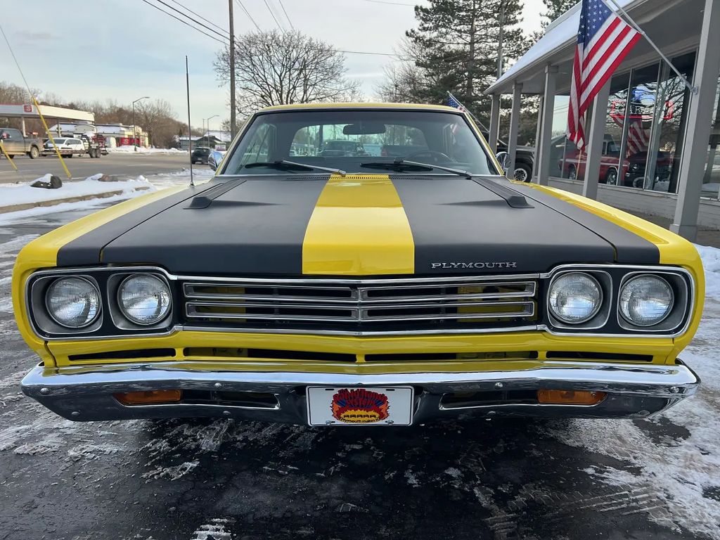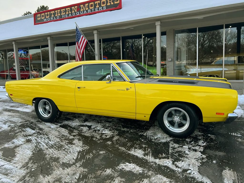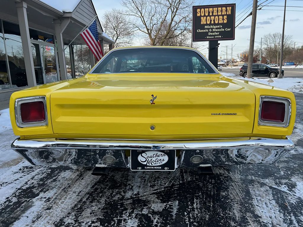 Recent Body-Up Restoration, True (RM) Road Runner, beautiful Competition yellow paint, black vinyl interior, black performance hood striping, mild built 440 ci engine, Edelbrock 4 bbl, factory intake & exhaust manifolds, electronic ignition, factory air cleaner, Mopar Performance aluminum valve covers, power steering, 727 Torqueflite automatic transmission, factory bench seat, factory steering wheel, factory tach & gauges (aftermarket under dash), factory am-fm radio, dual exhaust, factory 8 ¾ 3.23 rear axle, 275/60R15 rear tires, 215/65R15 fronts, 15” American Racing Torque Thrust D wheels, dual chrome mirrors, Mopar Muscle, Beep! Beep!
