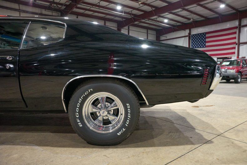 GR Auto Gallery is excited to present this 1971 Chevrolet Chevelle SS 454. Dressed in fresh black paint with bold white racing stripes, this Chevelle has the classic muscle car look that never goes out of style. The SS hood pins, clean chrome accents and aggressive stance all come together to give it that unmistakable street presence the Chevelle is famous for. The repaint gives the car a slick, deep shine, making the body lines and curves pop just the way enthusiasts like them.