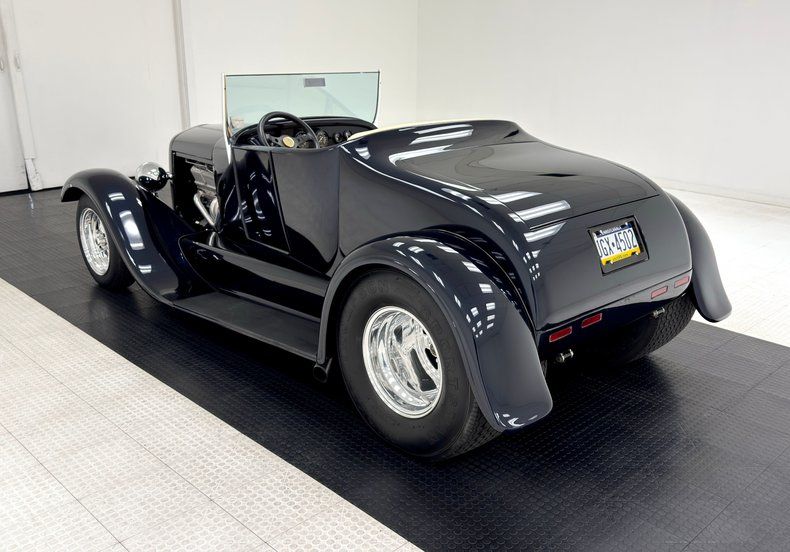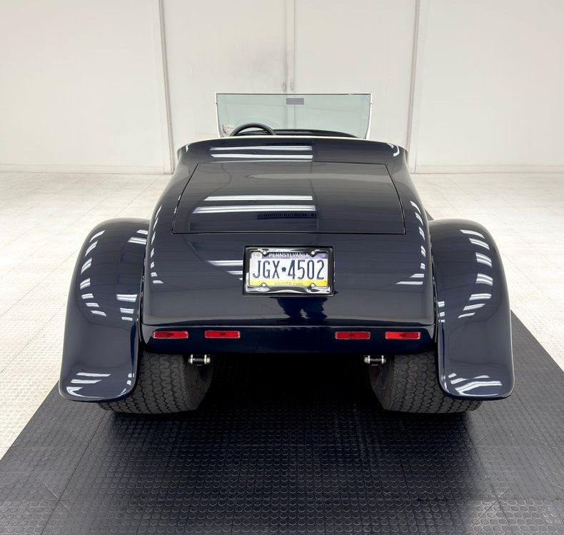 Two stage Midnight Blue coats this roadster and we're talking deep paint here and in certain light, it can look black while other light brings out the navy blue and it's nicely applied. Once you've absorbed the beauty of the paint, the wheel set up is next to compete for your attention, stacking 15-inch Weld wheels with vastly different widths and tires sizes, creating that classic hot rod stance that's been a proven winner for about 80 years, here under fiberglass fenders connected by a steel running board. In back, the rectangular quartet of tail lights get your attention right before the massive meats grab your eyes as they peek from narrow fenders. Up front, the fiberglass '32 radiator shell looks perfectly at home next to the aluminum hood which connects seamlessly to the fiberglass body. A modest windscreen with nicely sculpted posts completes the exterior which shows no glaring imperfections.
