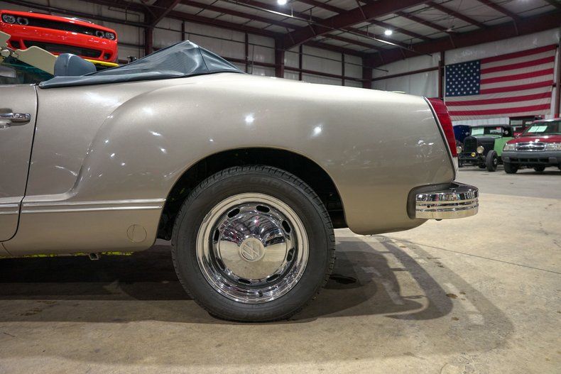 GR Auto Gallery is excited to present this 1974 Volkswagen Karmann Ghia Convertible. Finished in a classy Grey Metallic, this Ghia brings together timeless curves, smooth chrome trim, and a stylish stance riding on 15 inch chrome wheels. The blue manual convertible top with a glass rear window adds a unique color contrast that really sets this one apart, giving it a crisp, coastal personality. The body lines remain classic to the final years of Ghia production, delivering that unmistakable blend of European flair and vintage Volkswagen charm.