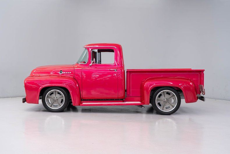 This classic 1956 F-100 has benefited from a full custom restoration with extensive mechanical upgrades. The exterior received an outstanding 2-stage respray of Metallic Pink Pearl. Accents include careful pinstriping and handsome HRBB alloy wheels (18" f/20" r) that mount Nitto NT555 Ultra-Performance radials. Chrome and stainless are excellent and a beautiful, finished wood floor with stainless trim has been installed in the bed.