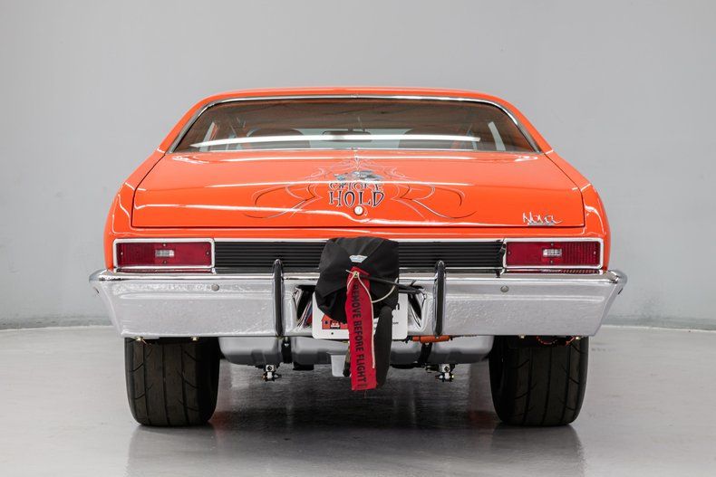 The Nova is a full bodied, all-steel sedan with a fiberglass hood that has a full interior. The custom 2-stage finish is an SPI product that is shade brighter than Hugger Orange. It was color sanded and the finish is on the virtually perfect body is exceptional. Accents include a custom hood, all new chrome/emblems/moldings/plates and a Stroud chute. Custom 'Choke-Hold' artwork and pin stripping have also been added (on top of the clear coat).