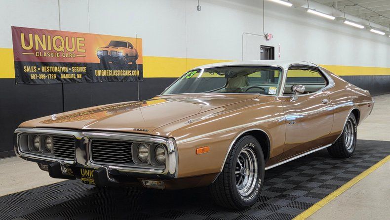 1973 Dodge Charger. 318 V8 powered model paired with an automatic transmission, finished in its original Aztec gold paint with a white vinyl canopy roof. Well-equipped with power steering, power brakes, and air conditioning, although the AC requires attention. The car's exterior is in good condition with minor imperfections typical of a 50-year-old vehicle. The interior reflects a true 1970s vibe, featuring patterned cloth and white vinyl combination seats and wood grain accents on the doors and dash. Some minor issues include inoperative windshield wipers, fuel gauge and radio, and the tailpipes and mufflers could use attention. On the road, the Charger drives smoothly, the automatic transmission shifts well with a functional kickdown, and the ride is comfortable.