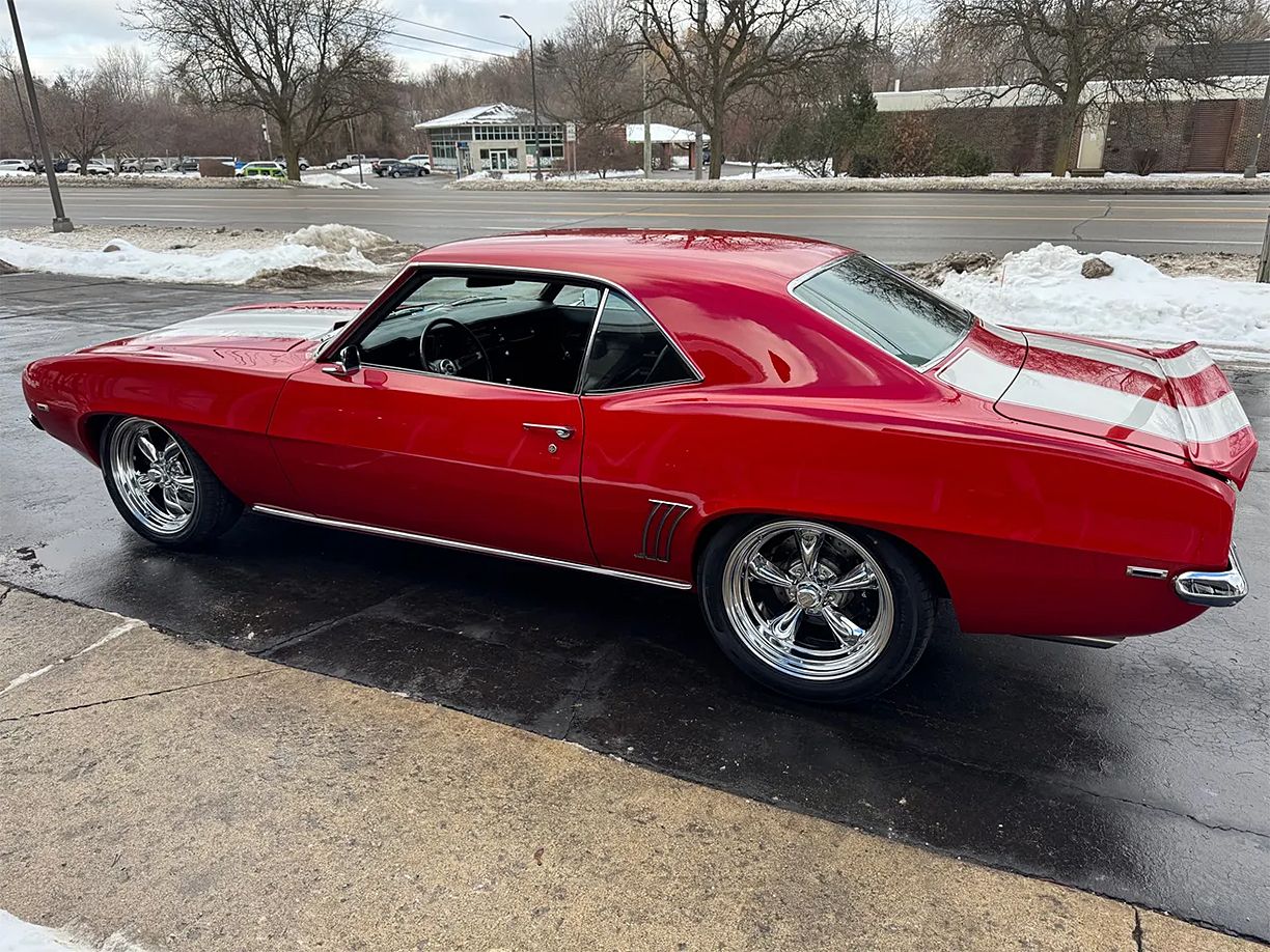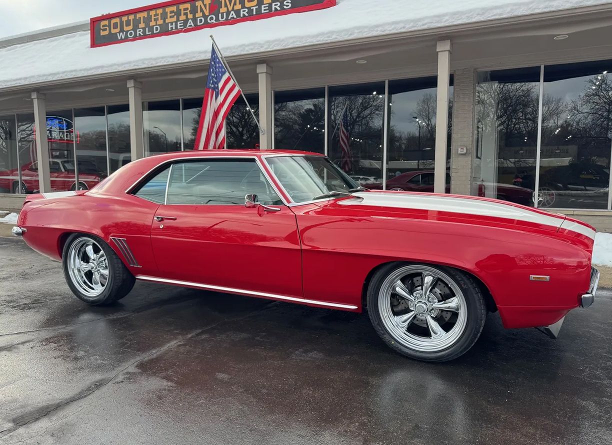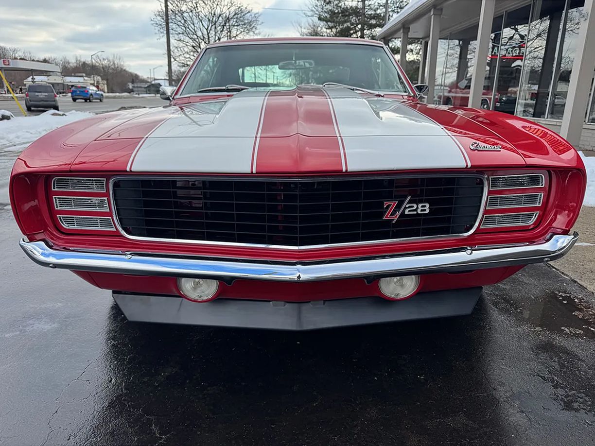 Only 1,400 miles on Rotisserie Restoration, clean Georgia car, beautiful Torch red paint, white Z28 striping, black Deluxe Hounds Tooth interior, 350 ci engine, Edelbrock 4 bbl, Edelbrock Air Gap aluminum intake, ceramic headers, mild camshaft, HEI distributor, chrome air cleaner & valve covers, power steering, Wildwood 4 wheel disc brakes with slotted & drilled rotors, factory air conditioning, 350 turbohydramatic transmission, factory bucket seats with center console, Sport wheel, factory tach & gauges, H-pipe Flowmaster dual exhaust, 12 bolt 3.55 limited slip rear axle, 255/45R18 rear tires, 225/45R18 fronts, 18” American Racing Torque Thrust wheels, front & rear spoilers, hide-away headlights, One Bad Bowtie!