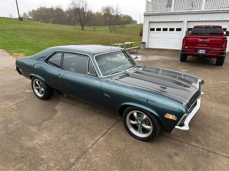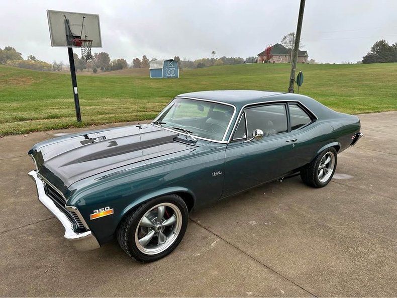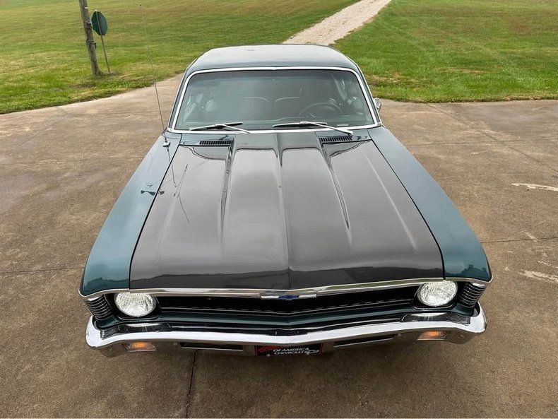 This 1970 Chevrolet Nova is a fun-driving and very dependable classic powered by a strong running 350 crate engine with about 1,000 miles on it. It features slick green paint complemented by a carbon fiber hood, and the body is reported to be nice and straight with solid floors, rockers, and trunk. The chrome, trim, and weatherstripping are said to look new. Under the hood, most components are noted as new and include an Edelbrock Performer intake, Holley carb, Optima battery, and an aluminum radiator. It is equipped with power steering and Baer power disc brakes, along with tubular A-arms, a 10 bolt rear, Cal-Tracs 4 link, and subframe connectors. It sits on 17" aluminum wheels with like-new BF Goodrich tires. The dual exhaust is paired with full length headers and mufflers. The interior is very clean and includes a factory bench seat, Quicksilver shifter, pillar gauges, a Grant steering wheel, and a CD player mounted in the glove box. It is noted that the car does not have A/C.
