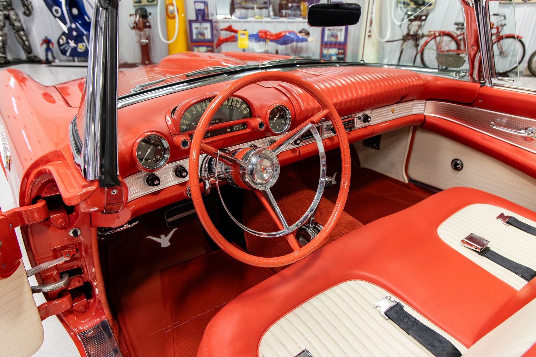 Finished in its original Fiesta Red with a Red & White interior, this Thunderbird was built May 14, 1956 in Dearborn, MI and is highly optioned with both tops, power steering, power brakes, power windows, 4-way power seat, Ford-O-Matic transmission, engine dress-up kit, wire wheels, Continental Kit, and more.