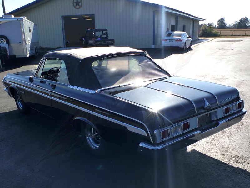 The Dodge Polara was introduced in 1960 as Dodge's top of the line full size car. In 1962 the car was downsized to be a mid-sized car and the name plate was now a step below the Custom 880. They were very interesting cars that were redesigned every year and often changed appearances within the same generations. It is interesting to look at a 1st gen 1960 Polara and compare it to cars like this 2nd gen 1964 because in just 4 short years their look changed in extreme ways. The muscle car "Hey Day" had not yet arrived but in '64 you could definitely start to see the direction things were heading. This 1964 Dodge Polara 500 Convertible is a very neat car with a very unique look. It has nice Black paint paired with a Black power top. It is the factory ordered colors but it has been repainted at some point in its past. The car once belonged to a big Mopar collector and he believed it to be the only triple Black Polara 500 Convertible with a Street Wedge Motor but with limited production numbers available that is undocumented. These cars had very a very unique headlight and grill set up which is in good condition. It was also ordered with premium grade trim which run the length of the car and features an engine turned center piece. All of the stock exterior chrome is nicely mounted in place including the manually adjustable drivers side mirror. The car rides on its original wheels which feature matching Black paint.
