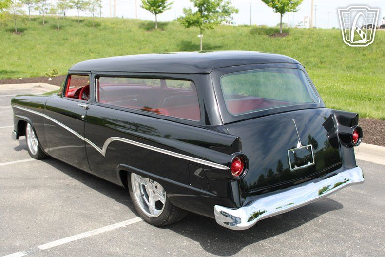 Gateway Classic Cars of Kansas City is proud to present a blend of classic style and modern performance with this stunning 1956 Ford Ranch Wagon Pro-Touring Restomod. This iconic vehicle captures the essence of mid-century American automotive design, featuring a sleek black exterior that exudes timeless elegance. The bold color choice is complemented by a striking bright red leather interior, offering an inviting and luxurious cabin that will turn heads wherever you go.