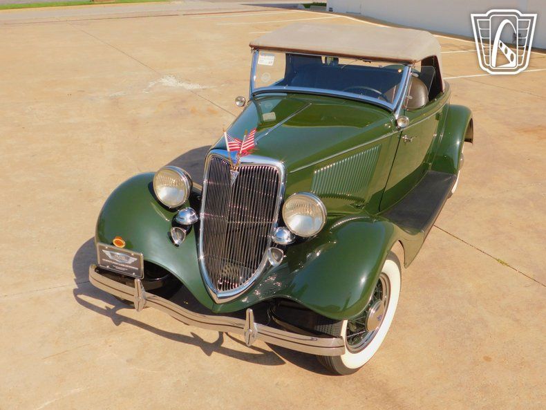 The 1934 Ford Roadster features a manual convertible top that is in great shape, allowing for an open-air driving experience that enhances the joy of every journey. The interior is adorned with luxurious brown leather, providing a touch of elegance and a comfortable ride. The vehicle is equipped with wide white walls, adding a classic flair to its overall appearance, while the classic wire wheels contribute to its distinctive and timeless design.