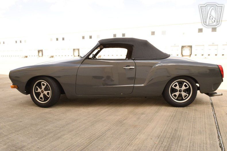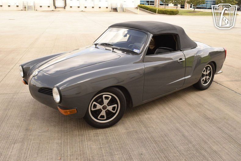 The exterior is finished in a sophisticated gray hue that accentuates the graceful, flowing lines characteristic of the Karmann Ghia's Italianinspired design. The manual convertible soft top offers both open-air freedom and cozy closedtop comfort, while chrome hub caps add a tasteful metallic contrast that recalls the automotive style of the era.