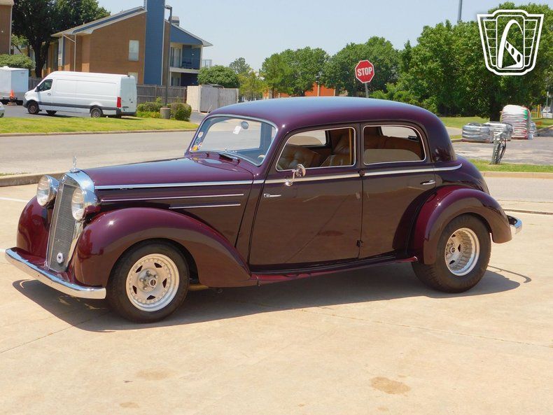 Gateway Classic Cars of Tulsa is proud to represent this stunning one of a kind 1948 Mercedes-Benz Custom Hot-Rod, a true masterpiece of automotive craftsmanship. This '48 beauty is one of one and has had extensive modifications done to everything from the frame up. This classic beauty boasts a striking wine red exterior that comes from a '54 Mercedes line and commands attention with its timeless elegance. All the trim work shines bright and really adds that touch of class for these hard to find Mercedes. The all steel body had to borrow a few parts here and there from other old Mercedes but still looks amazing. That vibrant hue is nicely complemented by a luxurious tan leather interior that includes the infamous Connolly leather stitched into extremely comfortable custom pillow seats with padded leather door panels to match., creating a sophisticated and inviting cabin space.