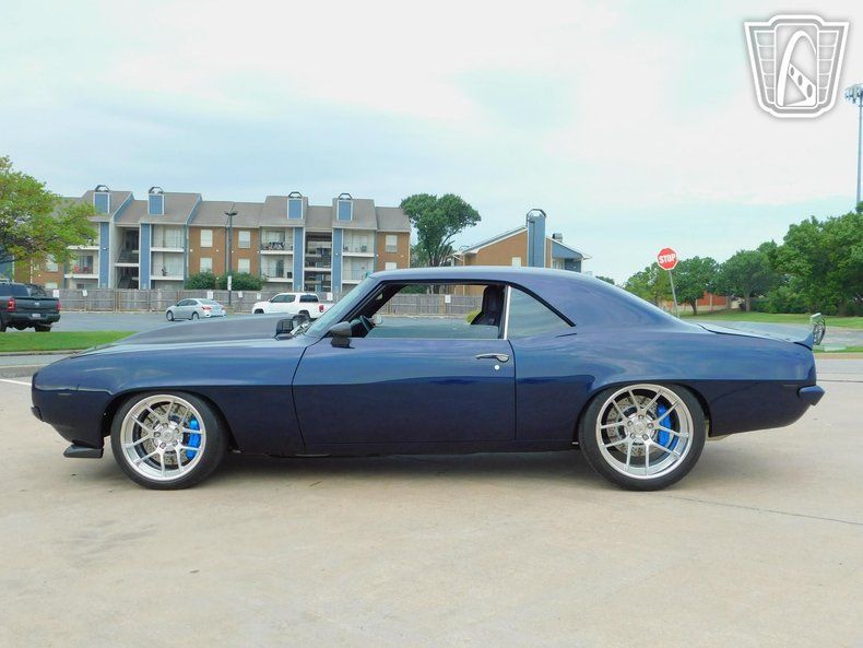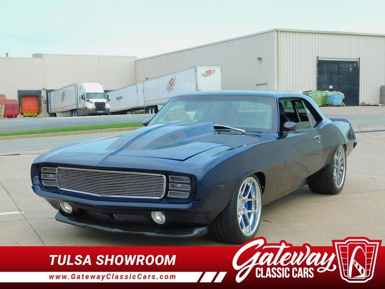 Gateway Classic Cars of Tulsa is proud to represent this stunning custom 1969 Chevrolet Camaro, a classic American muscle car that combines timeless style with high quality modern amenities. This iconic vehicle boasts a striking Stormy Blue exterior with carbon fiber incorporated throughout that captures attention wherever it goes. Step inside to find a luxurious black leather interior by TMI that offers both comfort and sophistication.
