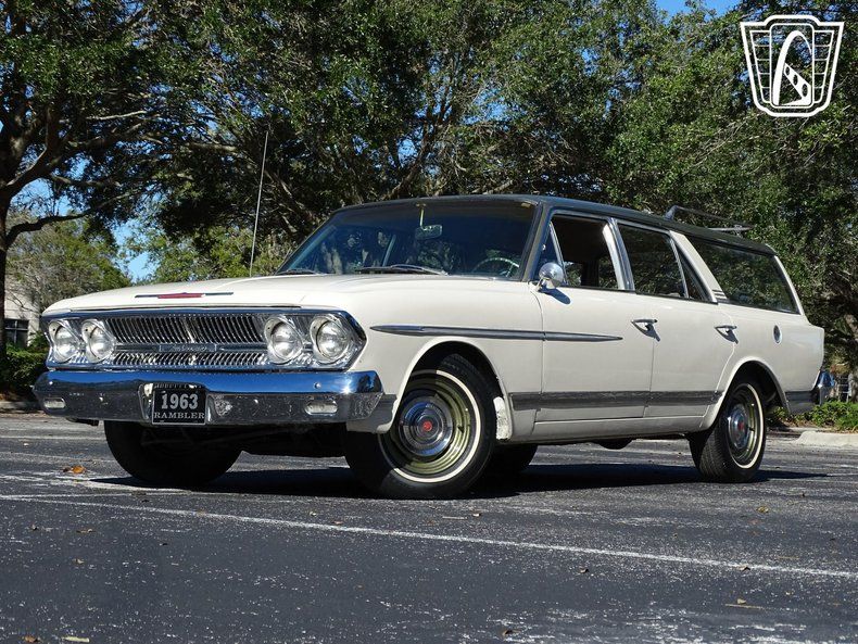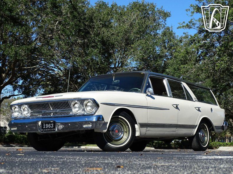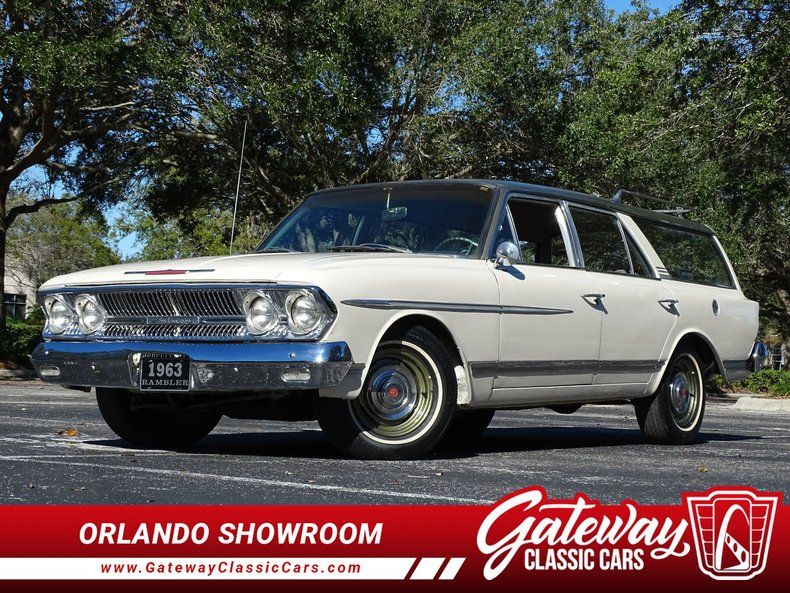 Gateway Classic Cars of Orlando is proud to present this beautiful 1963 Rambler Ambassador 990 wagon. Before minivans and SUVs all the cool moms were rolling around in full size station wagons. Beyond functional utility these cars oozed style and substance and perhaps the rarest of the 60s wagons was the Ambassador 990. This stylish wagon is painted in a white with a dark green roof contrasting handsomely. Take a walk around the vehicle and you'll notice nice details like the color keyed wheels, aluminum trim and roof luggage rack. Take a seat inside and you'll find a charming interior with plaid upholstery and a dashboard fit for a jet plane. Under the hood is a V8 and is paired with a 3 speed automatic. Imagine how this wagon can get up and go! If you're looking for a vintage family hauler that you don't see at just any car show, this is the one you want to own! Options include AM radio, power brakes, power steering, seat belts, cloth interior and radial tires.