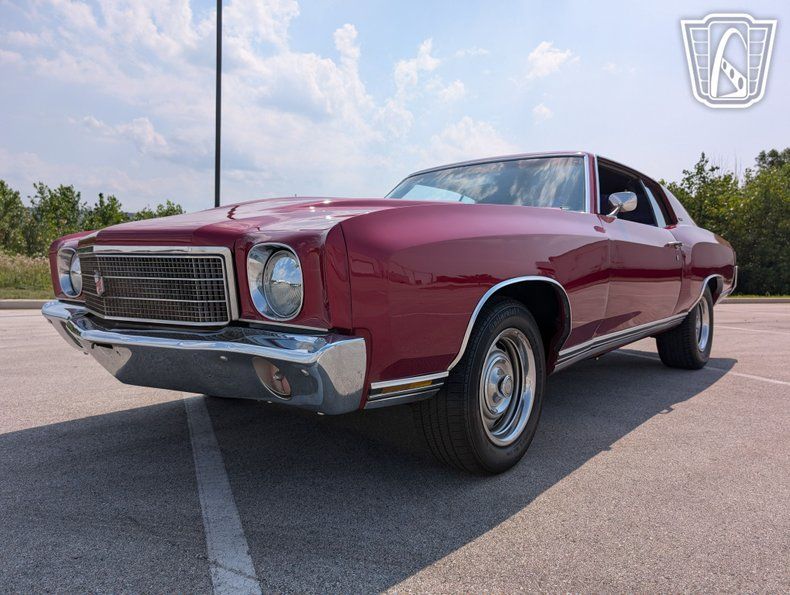 Introducing a classic icon of American automotive history, the 1970 Chevrolet Monte Carlo, a vehicle that embodies the spirit of the muscle car era with its bold design and powerful performance. This particular model stands out with its striking red exterior, a color that not only captures attention but also highlights the sleek lines and timeless elegance of the Monte Carlo's design. Paired with a sophisticated black interior, this car offers a visually appealing contrast that enhances its overall allure.
