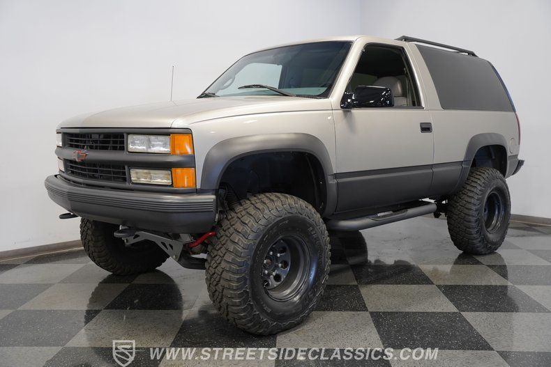 Ushering in the last class of its model featuring a 2-door configuration, this 1999 Chevrolet Tahoe Sport 4x4 is one nice-looking SUV. Its distinctive configuration really enhances its robust, boxy shape and, dressed in high-gloss pewter paint with matte charcoal gray bumpers and matching accent trim along its sides, it has a vital appearance that's backed up by a confidence-inspiring running condition. At the same time, an aggressive 6" lift that comes via an RCD kit combines with a set of beefy BF Goodrich Mud-Terrain tires and Smittybilt tubular running boards to underscore the notion that this stout Chevy is every bit at home off the asphalt as it is cruising the highways and boulevards.