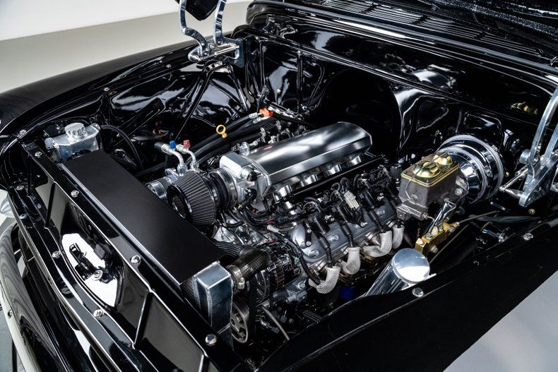 The body was taken through a ground-up restoration and finished in deep, jet-black two-stage paint that gives the truck a formal, tuxedo-like presence. Panel fit is excellent throughout, with straight body lines and clean gaps that far exceed factory standards. Restored chrome adds crisp contrast, while details like the cab visor, LED lighting, and retractable Nomad-style tailgate cable tethers sharpen the truck's finished look. The stance is dialed in on 15" steel wheels wrapped in BFGoodrich Silvertown Radials with wide whitewalls, giving the truck undeniable curb appeal. Out back, the finished oak bed floor with polished stainless slats delivers classic style with durability to match.
