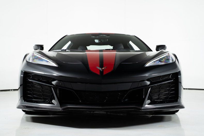 Finished with Edge Red full-length dual racing stripes, this black Corvette has a menacing, purposeful look. Inside, the Jet Black interior with Adrenaline Red accents is paired with the 3LZ package, adding a custom leather-wrapped instrument panel, heated steering wheel, sueded microfiber trim, and two-tone Napa leather GT2 seats with heating and ventilation. Carbon fiber trim and paddle shifters reinforce the performance-focused feel.