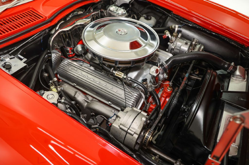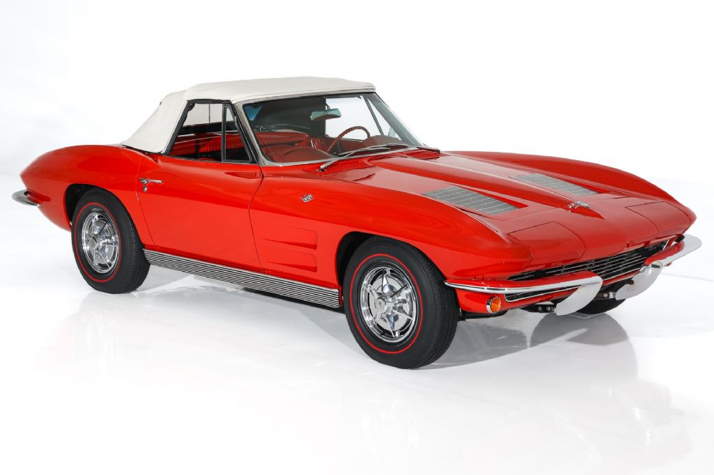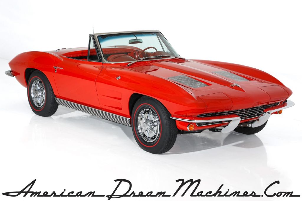 Stunning Riverside Red 1963 Corvette Stingray roadster with white soft top and painted to match hardtop. This Corvette has had and extensive restoration and has some very desirable upgrades. The stingray body is has great lines and panel fitment and was professionally painted in correct code-923 Riverside Red jeweled in lots of newer and polished chrome and stainless all the way around. The lush red interior is stunning, with newer red seat covers and features rare tilt steering column for a little more leg room and exceptional dash with restored instrumentation and clock, a new glove box door, lots of newer stainless trim, correct Corvette matching red 3 spoke aluminum steering wheel and newer Corvette stereo with a 10 disc cd changer in the back. Under the hood appears factory correct and show cases an upgraded GM 350 cubic inch crate engine with a little more horsepower, topped off with correct Corvette polished aluminum valve covers, correct Winters intake and chrome ignition shielding and correct factory chrome air cleaner for a factory correct, original appearance. Other desirable upgrades include newer Vintage A/C and a newer aluminum radiator to keep you and the car cool on those hot summer days. The Muncie transmission debuted in 1963 and this car retains its numbers matching 4-speed transmission to control the power and is backed by the stock rear end that has posi-traction and a heavy duty 4.11 gear. This American Dream Machine is rolling brand new Corvette full size spinner hubcaps and Coker Classic redline tires that match the car perfectly.