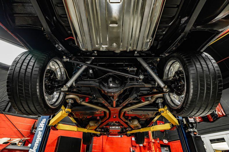 Inside, this custom Chevy is sporting a Red Interior with Front Bench Seating, Factory Style Steering Wheel, Dakota Digital Gauges and a Custom Upholstered Trunk! Take a look underneath to see the beautiful condition of the Frame, Floorboards, Stainless Steel Fuel Tank, Independent Front Suspension with Ridetech Suspension and the Dual Exhaust System that's tucked nicely along the frame!