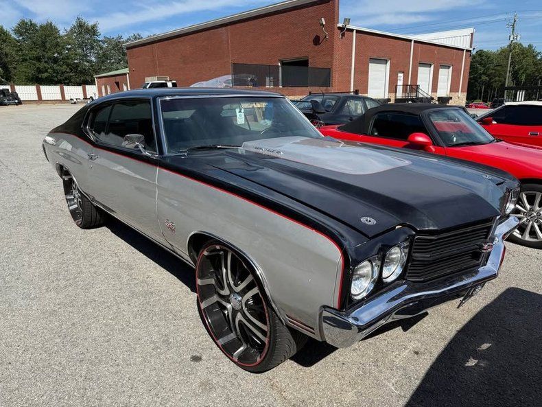 This 1970 Chevrolet Chevelle Malibu SS is a classic muscle car powered by an original 454 big block V8 paired with a 700R4 4-speed automatic overdrive transmission. It has been treated to extensive documented upgrades and repairs in 2025, including a fresh engine re-seal with new gaskets, fluids, oil pump, pickup, timing set, and cooler with hoses. A Dakota Digital dash cluster and sensors have been professionally installed, along with a touchscreen and JL Audio premium sound system. It also features a Vintage Air A/C system for added comfort. The exterior is described as silver with a black vinyl top, black racing stripes, and SS badging, while the interior is a custom two-tone black/gray setup with red piping. Rolling stock includes 22-inch custom wheels with red accents along with a recent repair and a new tire. Mileage is listed as 187,000 miles, and a Dakota Digital dash cluster has been installed.