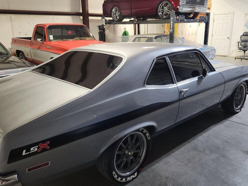 This 1972 Chevrolet Nova is a modified coupe with a performance-focused build. It features an LSX engine bored .30 over and topped off with a Jegg's cam, paired with a 5-speed manual transmission. The seller states it has 1,500 miles since the build. It is equipped with Hotchkis suspension and braking upgrades including slotted rotors and disc brakes all the way around. The exterior is described as silver, and the photos show a black interior with aftermarket gauges and an upgraded steering wheel. Overall, it is presented as a one-of-a-kind Nova built for strong road handling and spirited driving.