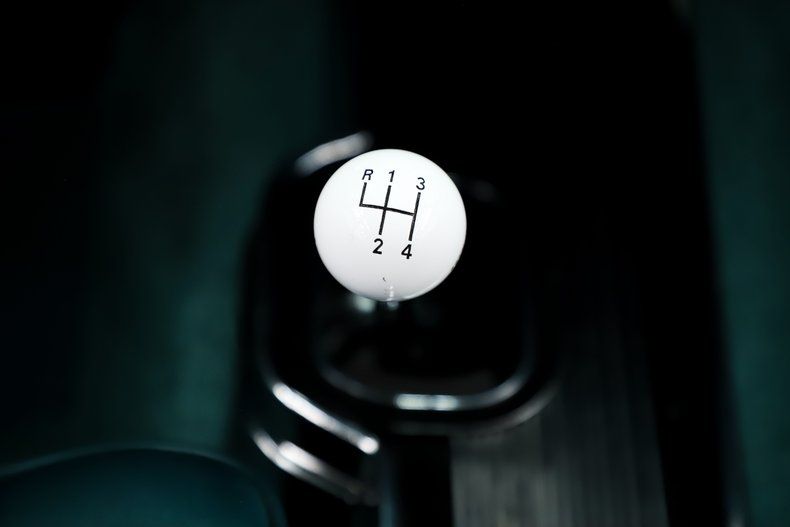 INTERIOR: Inside the door jambs are as slick as the exterior. The weatherstrips and sill plates were also replaced. The Turquoise Morrokide interior adds to this car's unique appeal, that's a color you really don't see often. We were told the upholstery is original! I do know that the door panels and armrests have been replaced and everything else is in remarkable overall condition. The seats don't have any rips or tears. The gauge bezel has really nice wood trim, all the gauges are in wonderful shape, and very easy to read too. It has a working clock, original heater controls and radio. The dash has been beautifully repainted the correct way with a satin finish on the top for glare reduction and a glossy finish on the bottom for more appeal. The kick panels are in excellent condition and the turquoise carpet looks fresh. The deluxe steering wheel looks to be a brand new reproduction. The center console was nicely refurbished and the Hurst 4-speed shifter puts the driver in command of the power.