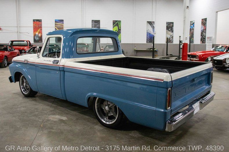 GR Auto Gallery is pleased to present this stunning 1964 Ford F100 for your consideration. This beautifully executed truck features an older rotisserie restoration and comes finished in a striking Blue and White exterior over a custom Brown interior with double diamond stitched seats and door panels. Power comes from a strong running small block 350 cubic inch V8, paired with a TH350 automatic transmission and geared to a Ford 9-inch rear end for confident cruising. This F100 is loaded with high-quality upgrades, including Wilwood high-performance four-wheel disc brakes, a Hotchkis sport suspension system, Billet Specialties wheels, chrome front and rear bumpers, a relocated fuel cell from the cab to the rear bed, crank windows, a Kicker USB/Aux audio system, car cover, and much more. Drive this one out of our showroom or have us assist with shipping it to you anywhere in the United States! Don't hesitate to call us with any questions or for more information.