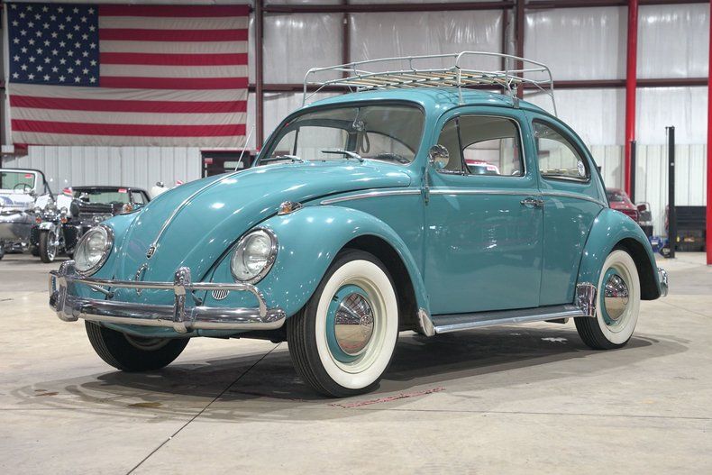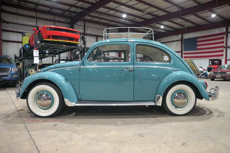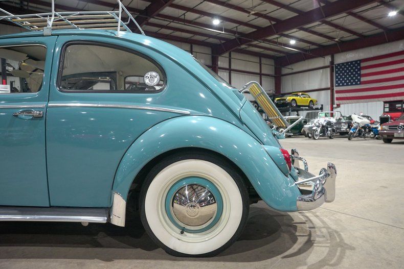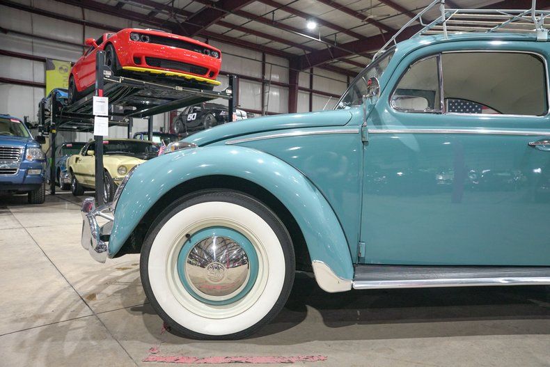 GR Auto Gallery is excited to present this charming 1962 Volkswagen Beetle finished in classic Gulf Blue, a color that perfectly captures the spirit of early 60s motoring. The paint matched blue wheels paired with chrome hubcaps and wide whitewall tires give it that unmistakable vintage stance. Chrome bumpers add just the right amount of shine, while the roof mounted luggage rack and rare trunk mounted luggage rack bring both character and practicality. It has that simple, honest look that makes you smile before you even turn the key.