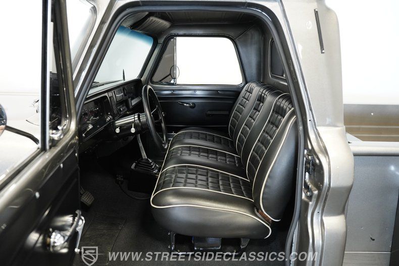 The interior is fully customized and just as impressive as the exterior. The small black door cards are in great shape, while the rest of both doors and the area where the headliner would normally be are painted to match the exterior color. The black vinyl bench seat features gray piping and diamond-stitched inserts and is presented in excellent condition. A blacked-out steering wheel continues the theme, paired with a black T-handle shifter on a B&M setup. The dash is clean, highlighted by a bright and easy-to-read Intellitronix digital gauge cluster. A Switch-Pros auxiliary switch panel is installed to the right of the steering wheel, with an aftermarket Kenwood stereo further over. Mounted under the radio is an aftermarket air conditioning unit, while a Holley EFI controller sits on the dash for quick tuning access. The result is a cabin that blends classic style with modern performance technology.