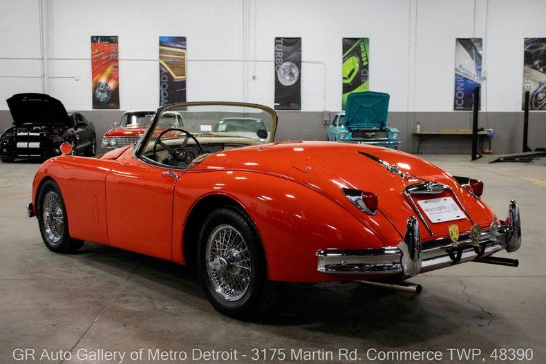 GR Auto Gallery is pleased to present this beautifully restored 1958 Jaguar XK150 for your consideration. Finished in stunning Ferrari Red over a crisp White interior, this XK150 is a true British sports car icon with just 1,052 miles since its comprehensive frame-on restoration was completed in 2000, with receipts documenting parts and labor. Power comes from the original 3.4 liter inline 6 cylinder engine featuring dual SU carburetors, paired with a desirable 4-speed manual transmission. This Jaguar is equipped with four wheel disc brakes, a stainless steel exhaust system, 16-inch knock-off wire spoked wheels wrapped in Pirelli 225/60R16 tires, chrome front and rear bumpers, Smith gauges, a functional dash clock, and a classic four-spoke steering wheel. Additional highlights include a tan cloth soft top, crank windows, a spacious trunk, car cover, and its exceptionally clean, well-cared-for presentation throughout. Drive this one out of our showroom or have us assist with shipping it to you anywhere in the United States! Don't hesitate to call us with any questions or for more information.