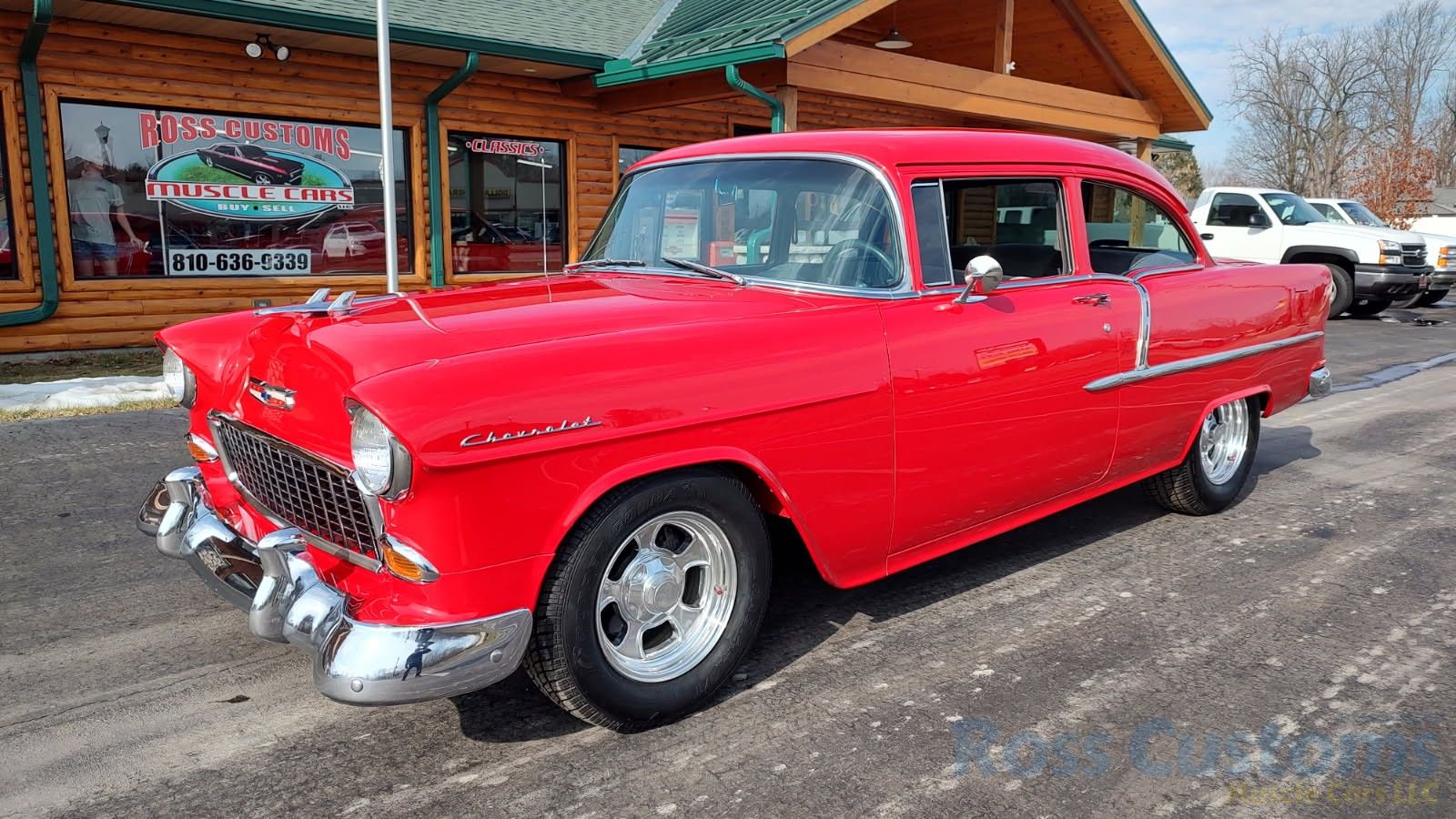 This is a slick 55 210 that has undergone a very nice custom build, done in Apple Red, basecoat clearcoat, sanded and wheeled smooth, slick as glass, at time of build had all new smoke tinted glass; as well as tinted windshield, new window rubbers, window felts and weather stripping, window stainless moldings are original and have been re-polished to a show finish; as well as upper door stainless moldings, new side view mirrors, antenna, door handles, hood jet and hood emblem, hood bar and grill side moldings look like new, stainless grill in excellent condition, lower grill molding appear to be original in very good condition, new parking lights and housings, re-chromed front bumper and bumperettes, original body side moldings have been re-polished to a show finish, new taillight and taillight bezels, new deck lid emblem, re-chromed rear bumper and bumper guards.