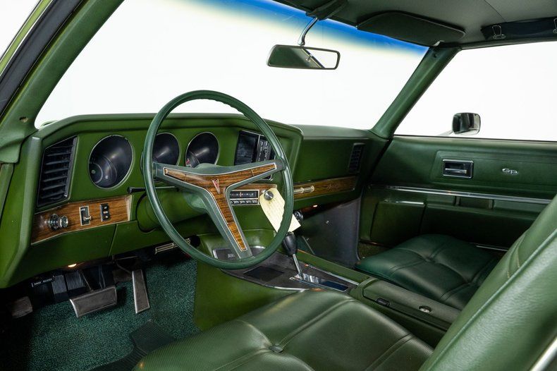 Finished in green with a black vinyl top and a factory hood-mounted tach, this '72 Pontiac Grand Prix makes a bold first impression. The green interior features bucket seats, a center console, and Pontiac's signature wraparound dashboard. Additional features include power front disc brakes, power steering, air conditioning, and Pontiac Rally wheels wrapped in Firestone tires.