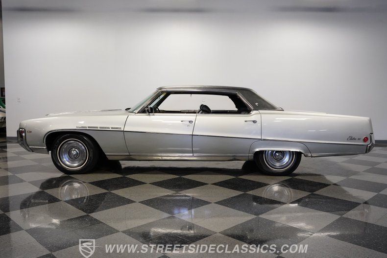 This is cruising in luxury. Here we have a Silver Mist 1969 Buick Electra 225 Custom. Polished hubcaps with whitewall tires and rear fender skirts give this big Buick its classic presence. All of the brightwork, moldings, and emblems appear correct and intact. The chrome bumpers are solid, the black vinyl top adds a classy contrast, and the front grille is in good shape.