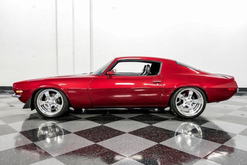 Some cars are more than transportation-they're a statement. This 1972 Chevrolet Camaro RS Restomod delivers that presence the moment it rolls in, its Claret Metallic PPG paint and black racing stripes catching the light while the lowered stance and staggered 19-inch front / 20-inch rear polished Bonspeed wheels set the tone. Custom touches like the carbon front spoiler, redesigned grille, LED taillights, and Anzo headlights sharpen its attitude even further. Built for enthusiasts who want classic style backed by modern performance, this Camaro blends history with high-quality craftsmanship, offering a restomod experience designed to turn heads at any show, cruise, or weekend meet.