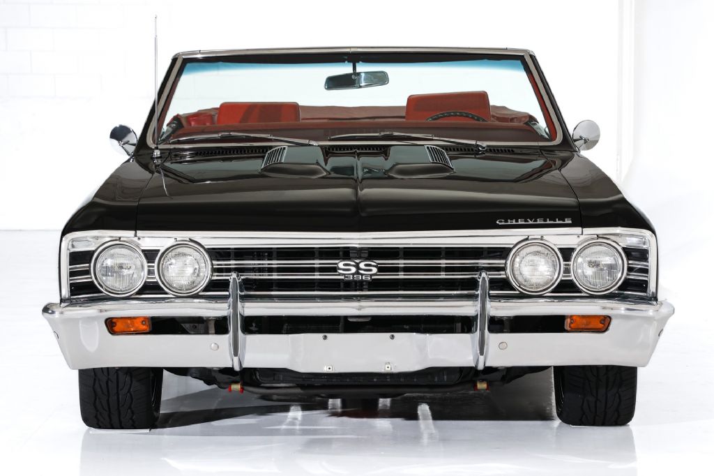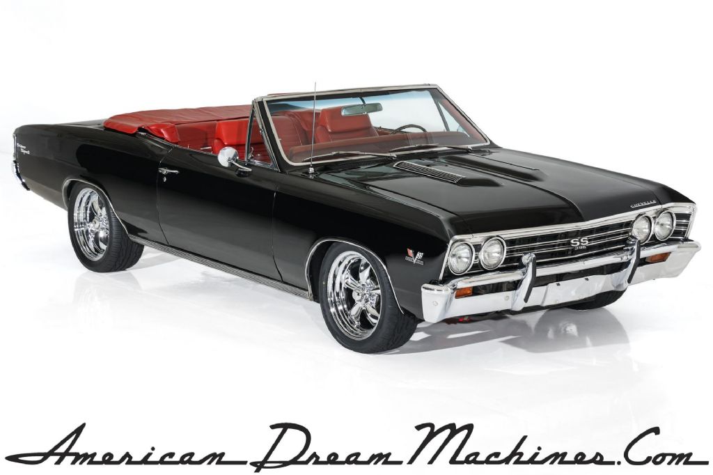 Beautiful Tuxedo Black 1967 Chevelle convertible with very nice newer red bucket seat interior with console topped off with a newer black powered soft top. This stunning black Chevelle convertible is loaded with performance upgrades and SS options. Powered by performance built 396/360 big block engine and launched by a TH400 heavy duty 3-speed automatic transmission and backed by a 12 bolt rear end with posi-traction and a highway gear. Nicely equipped with power steering and power front disc brakes for safety and driving pleasure. Structurally beautiful western body that is finished in beautiful Tuxedo Black paint, Super Sport hood, SS tail panel, SS emblems and very nice chrome and stainless trim. The interior features newer red factory bucket seats with rare headrests, center console, tach and gauges, power windows, SS steering wheel, and rare factory air conditioning that is complete but will need to be serviced to blow cold. The undercarriage is excellent with crisp metal. New dual exhaust with stainless mufflers and chrome tips has a great rumble. This American Dream Machine is rolling on new 18" chrome Torque Thrust wheels and performance rated radials and has great curb appeal. Stock rally rims are available for exchange,