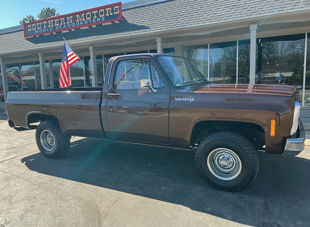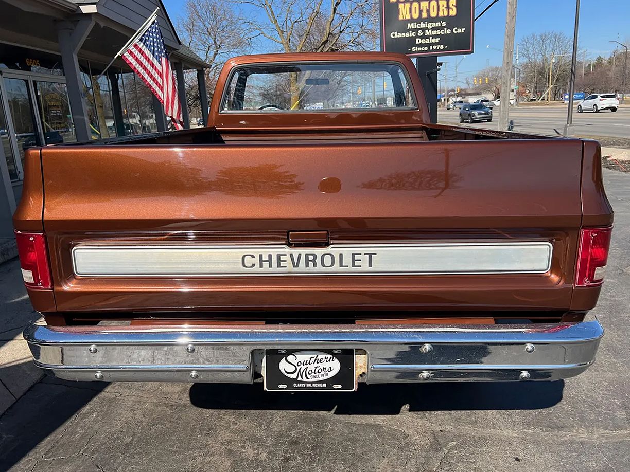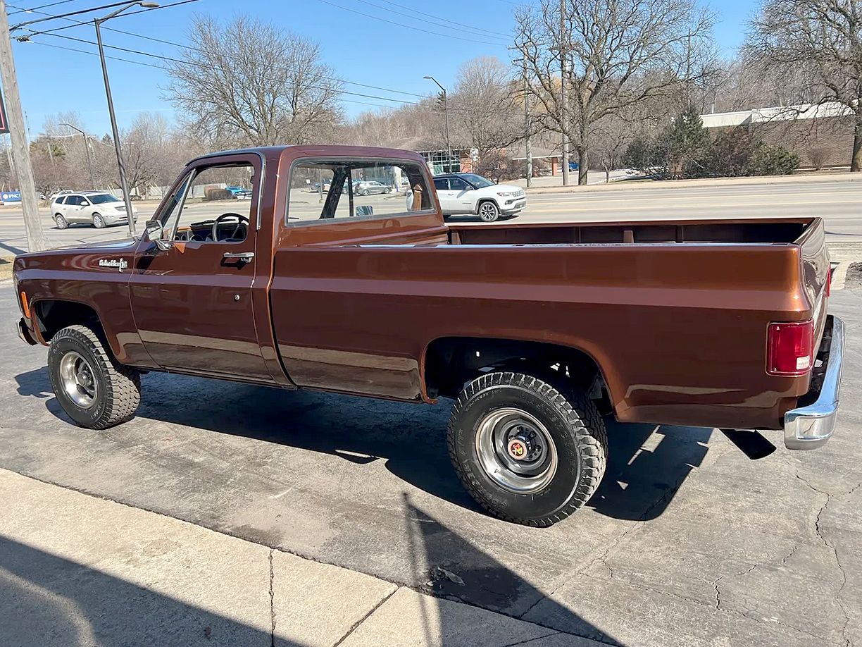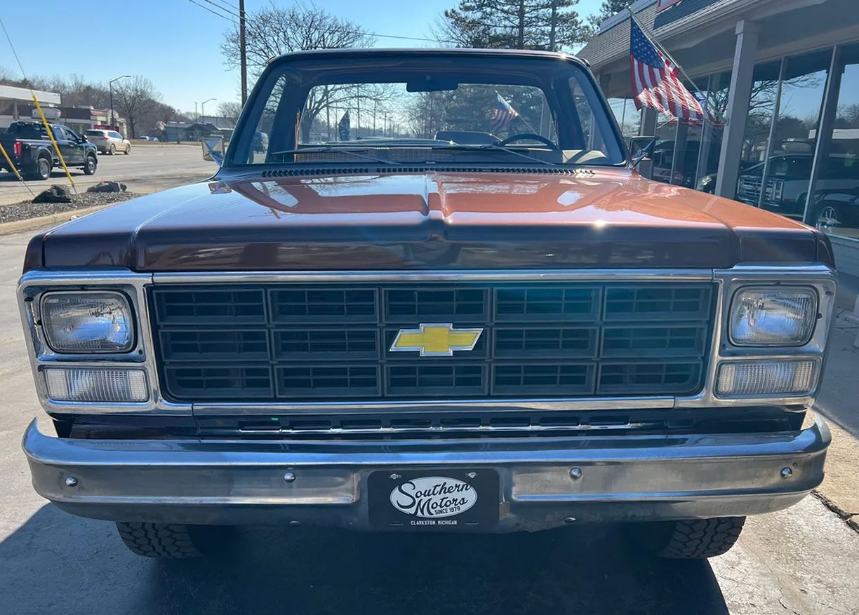 K10 4X4 truck, beautiful Brown Metallic paint, factory Saddle interior, 350ci V8 engine, Edelbrock 4 bbl, factory intake manifolds, headers, chrome air cleaner, power steering, power front disc brakes, automatic transmission, factory bench seat, factory dash & gauges, radio delete, dual exhaust, factory rear axle, 31X10.5R15LT tires, 15” Rally wheels, dual chrome mirrors, Ready to Cruise!