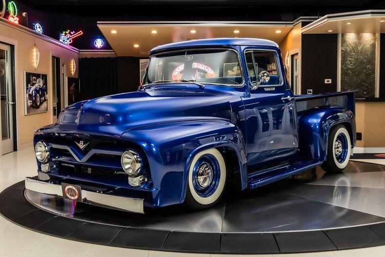 Check out this stunning 1956 Ford F100 Pickup Restomod! This F100 has undergone a complete, Frame-off Restoration with no expense spared! This Pickup has been finished in a beautiful Blue Metallic Exterior Color along with a Blue Stained Wood Lined Bed, Chrome Bumper & Grille, & Factory Style Hub Cap Wheels with Wide White Tires to Complete the look! Under the hood sits a 355ci Blue Print V8 Engine with a Edelbrock Four Barrel Carburetor making Around 390Hp. Power is sent to the rear wheels through a TH350 3-speed Automatic Transmission and a Corvette Style Rear End with a 3:07:1 Gear Ratio and Posi Traction. Additional Features include, Aluminum Radiator, Painted Inner Fenders, Rack and Pinion Power Steering and Power 4W Disc Brakes!